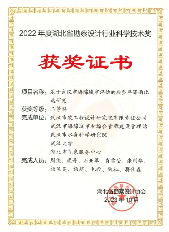 依托“城市內(nèi)澇防治與水環(huán)境流域治理技術(shù)中試平臺(tái)”開展的《基于武漢市海綿城市評(píng)估的典型年降雨比選研究》獲湖北省勘察設(shè)計(jì)協(xié)會(huì)科學(xué)技術(shù)二等獎(jiǎng)