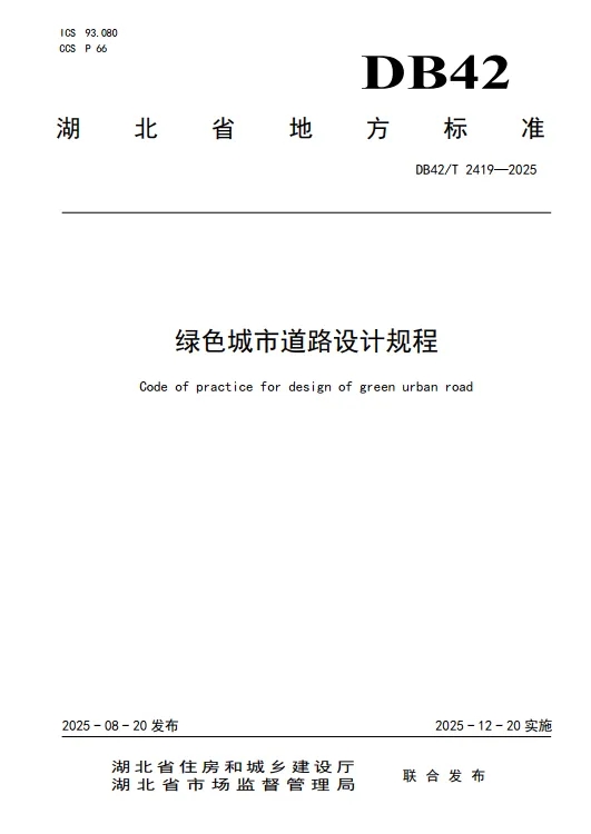 ? ? 近日,由武漢市政院主持編制的湖北省《綠色城市道路設(shè)計(jì)規(guī)程》(DB42/T 2419-2025)地方標(biāo)準(zhǔn),經(jīng)湖北省住房和城鄉(xiāng)建設(shè)廳、湖北省市場監(jiān)督管理局聯(lián)合批準(zhǔn)發(fā)布,將于2025年12月20日起正式實(shí)施。該標(biāo)準(zhǔn)是公司聯(lián)合行業(yè)多家單位,歷時(shí)三年深入調(diào)研國內(nèi)典型城市綠色道路建設(shè)實(shí)踐,系統(tǒng)總結(jié)湖北省實(shí)踐經(jīng)驗(yàn)的重要成果。