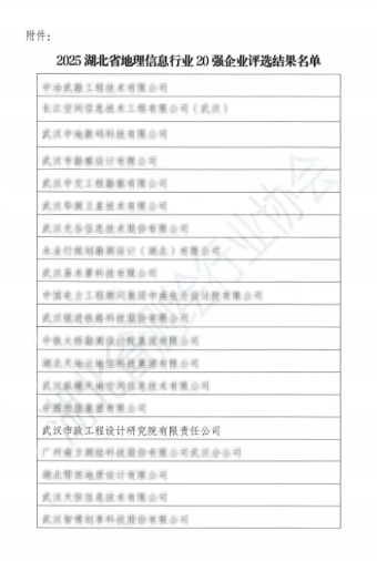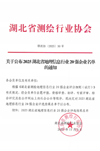 近日,從湖北省測繪行業(yè)協(xié)會傳來喜訊,武漢市政院憑借卓越的技術(shù)實力與行業(yè)貢獻,成功獲評“2025湖北省地理信息行業(yè)20強”。這一榮譽標(biāo)志著公司在測繪地理信息領(lǐng)域的專業(yè)能力獲得省級權(quán)威認(rèn)可,為企業(yè)發(fā)展里程碑再添濃墨重彩。