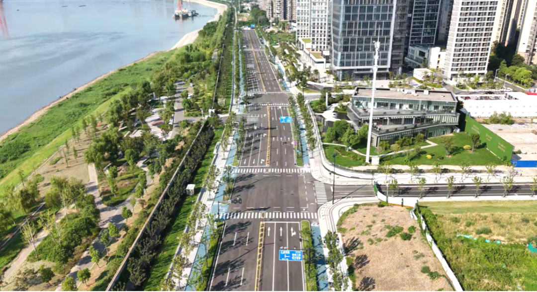本項(xiàng)目北起江安路,南至八坦路,全長約2.58公里,規(guī)劃為城市主干路。道路紅線寬40米,采用雙向6車道設(shè)計(jì),并實(shí)現(xiàn)了人行道、非機(jī)動車道與機(jī)動車道的完全分離,充分保障了所有交通參與者的安全與路權(quán)。本次通車范圍江盛西路~八坦路段長約1.8公里,該段道路的通車,極大改善了周邊數(shù)萬居民的出行條件,有效緩解了區(qū)域交通壓力。尤為重要的是,本道路成功承擔(dān)起“縫合紐帶”的功能,將沿線城市地塊與長江江灘公園有機(jī)銜接,并與濱江綠化景觀帶相互融合,共同構(gòu)建出連續(xù)、舒適、優(yōu)美的綠道及景觀系統(tǒng),為廣大市民和游客提供了更優(yōu)質(zhì)的漫步、騎行與游覽體驗(yàn),切實(shí)提升了濱江區(qū)域的公共空間品質(zhì)。
