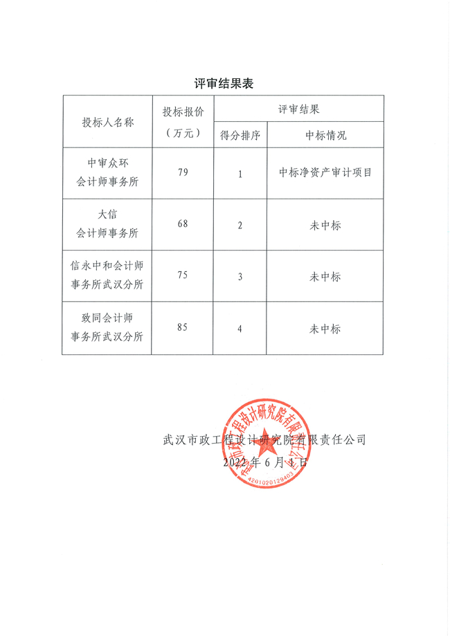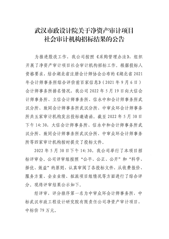 武漢市政設計院關(guān)于凈資產(chǎn)審計項目社會審計機構(gòu)招標結(jié)果的公告