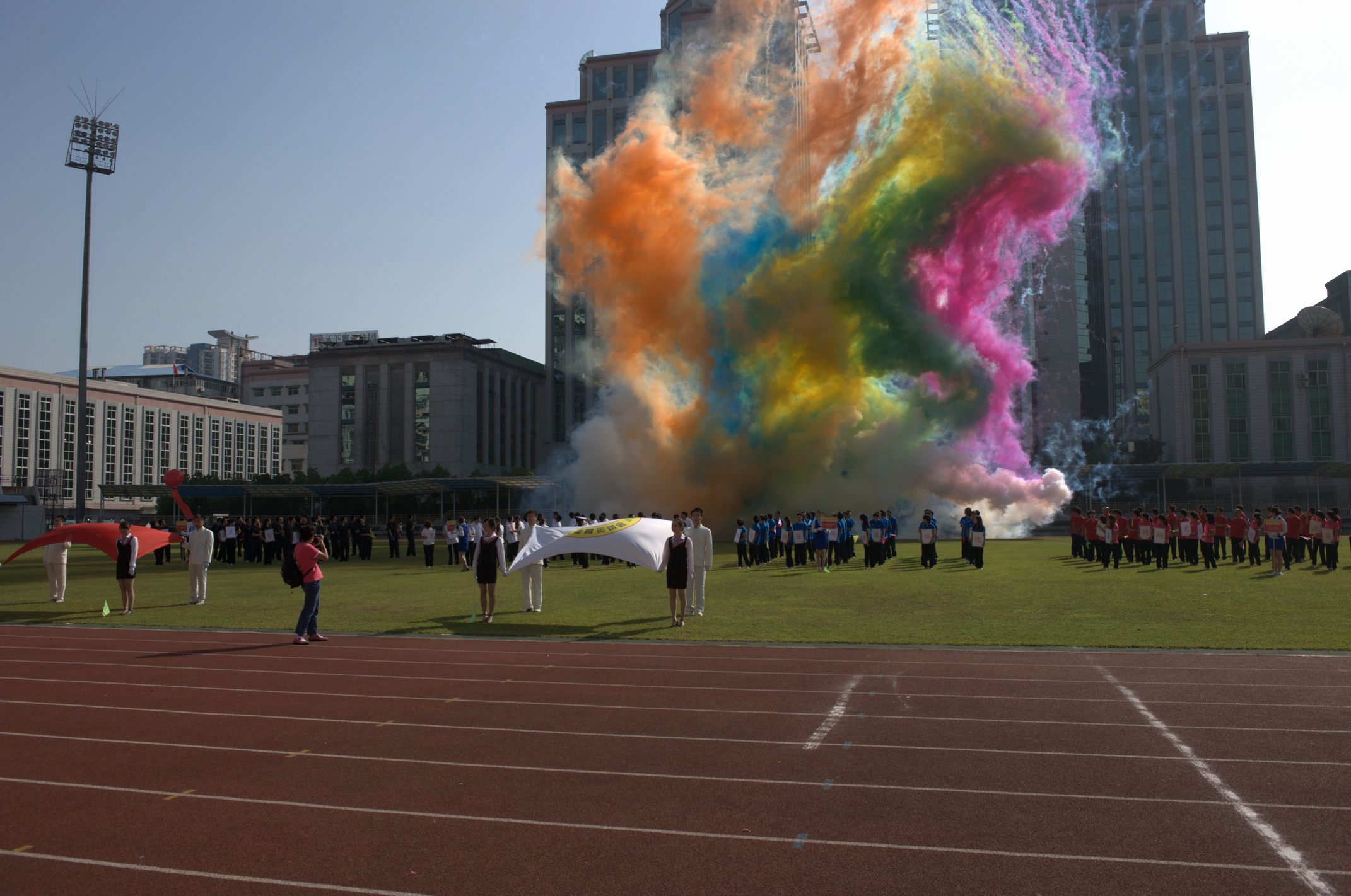 ??? 上午九點(diǎn),開幕式正式開始。在激昂的運(yùn)動(dòng)員進(jìn)行曲中,國旗方陣和會旗方陣先后從主席臺前經(jīng)過,在他們的引導(dǎo)下,四支代表隊(duì)的運(yùn)動(dòng)員方陣依次入場,精神抖擻,步伐矯健,展示出了蓬勃向上的精神風(fēng)貌。