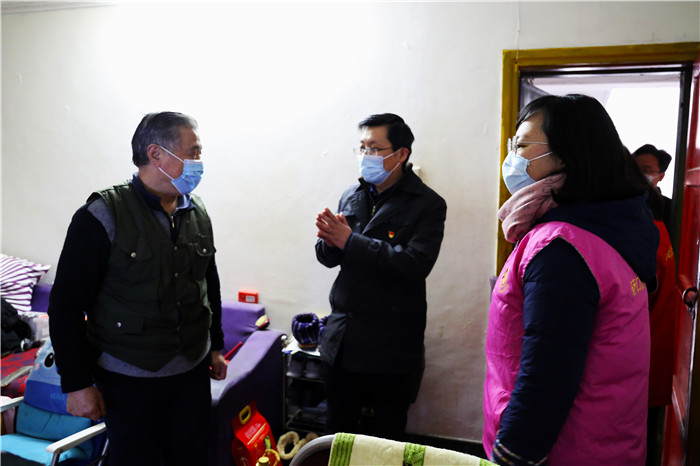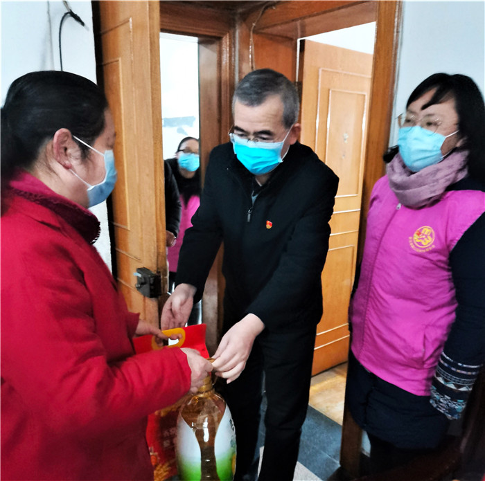 慰問期間,恰逢社區(qū)正在開展“臘八送福·甜蜜相伴”活動,談逢陽一行也加入其中,熱情地為前來的社區(qū)居民發(fā)放臘八米,送上殷切的節(jié)日祝福,叮囑他們要做好防護(hù)。